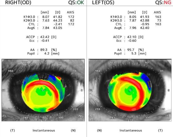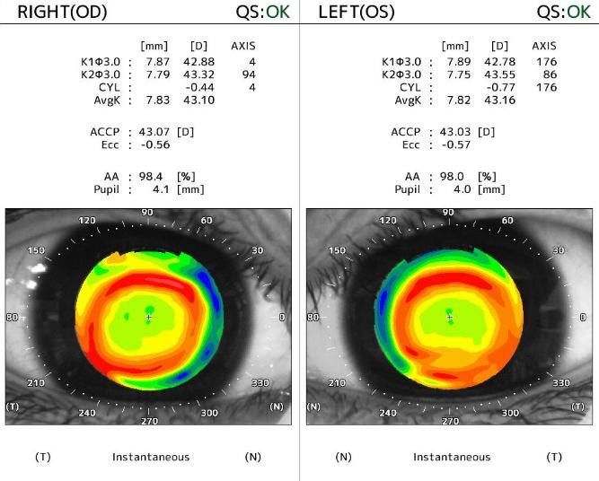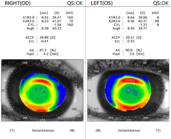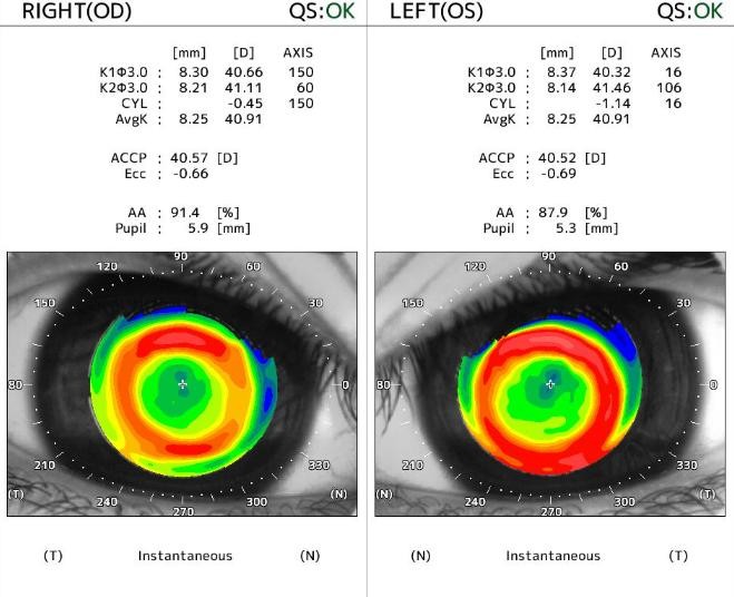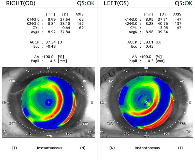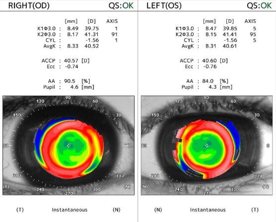 多くの方が、初装用から1週間~1か月以内に「よく見える」と実感されています。最初は少しゴロゴロ感がある場合もありますが、ほとんどの方がすぐに慣れ、日中を裸眼で快適に過ごせるようになります。角膜の形を調べるトポグラフィーでも、中央が平坦化し、光の通り道が整っている様子を確認できます。