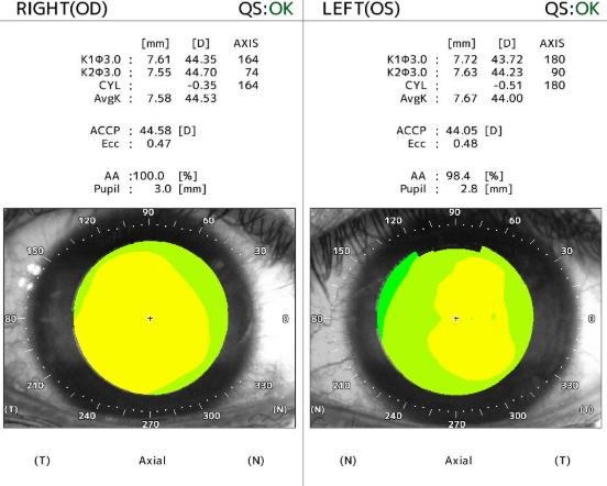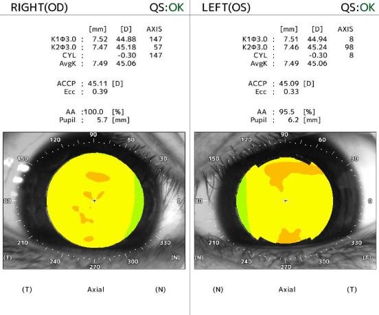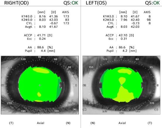 装用開始後のトポグラフィーでは、右眼はやや縦長の丸い形をしており、中央部分が緑色に染まっています。左眼は上下に抑えがありつつも、左右はややゆるやかで、中央は黄緑色に変化しています。