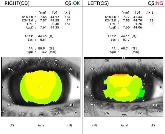 左眼は中央部が緑色で、やや縦長の形をしており、右側が赤く左側はオレンジ色に染まっています。このような色と形の変化は、角膜がレンズの働きでしっかりと整えられたことを示しており、結果として日中でも安定した裸眼視力が得られています。
