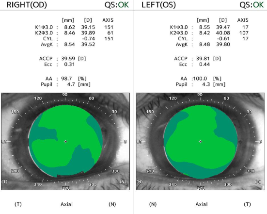 ・角膜形状:角膜形状は両眼ともフラットであり、本来はオルソケラトロジーにはあまり向いていませんでした。ただ、ご本人の「ぜひ試してみたい」との希望があり、十分に視力が出ない可能性があることをご理解いただいたうえで、スタートすることになりました。